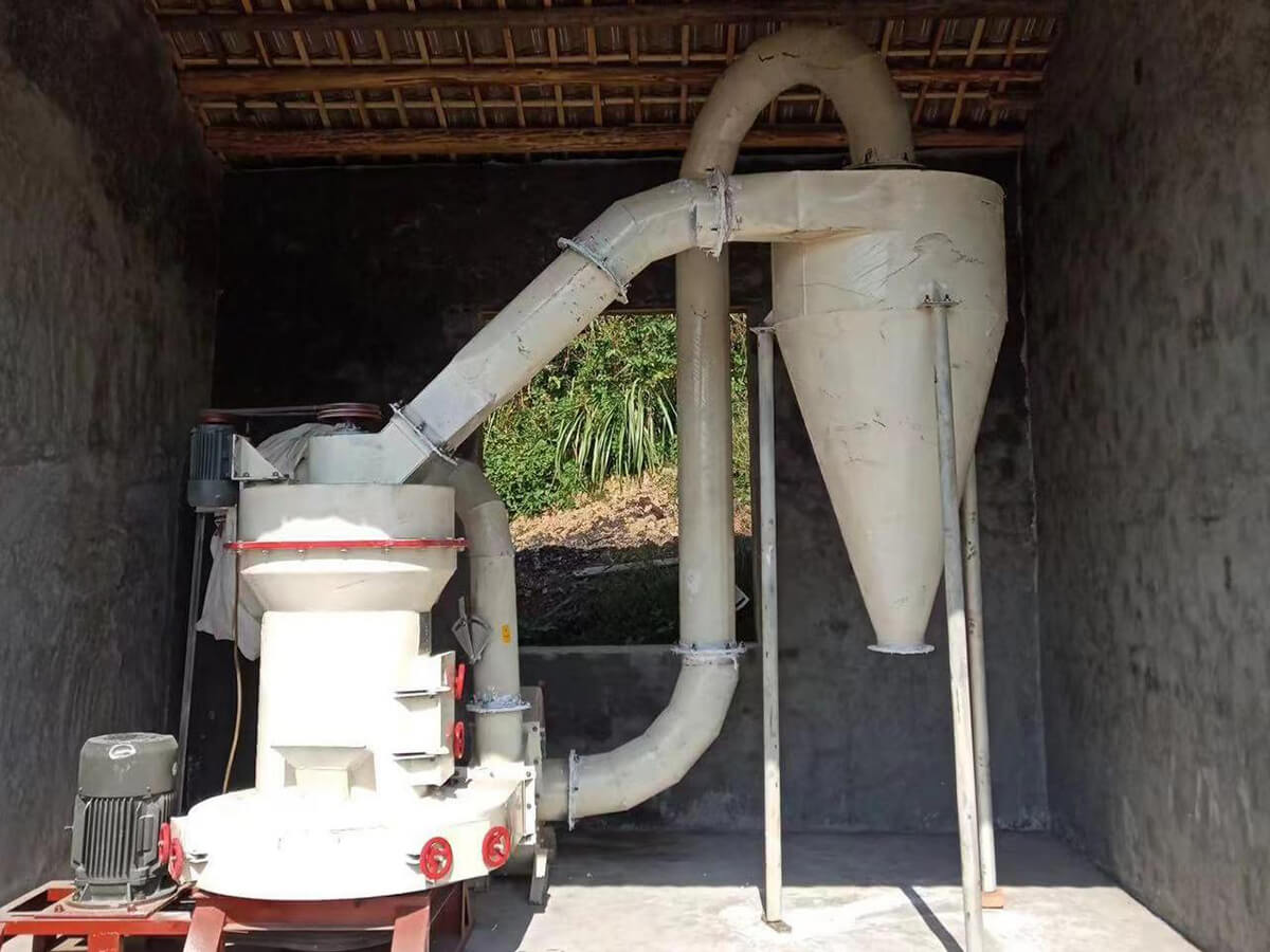 Bulk materials are crushed to the required particle size by a jaw crusher, then conveyed to a storage hopper by an elevator, and continuously and quantitatively fed into the main grinding chamber by a vibrating feeder for grinding. The ground powder is carried away by airflow from a blower and classified by an analyzer. The finer powder is carried by the airflow through a pipeline into a large cyclone separator for separation and collection, and the final finished powder is discharged from a valve. The airflow is drawn into the blower through the return air duct at the top of the large cyclone separator. The entire airflow system of this machine is a closed-loop circulation system, circulating under positive and negative pressure conditions.
